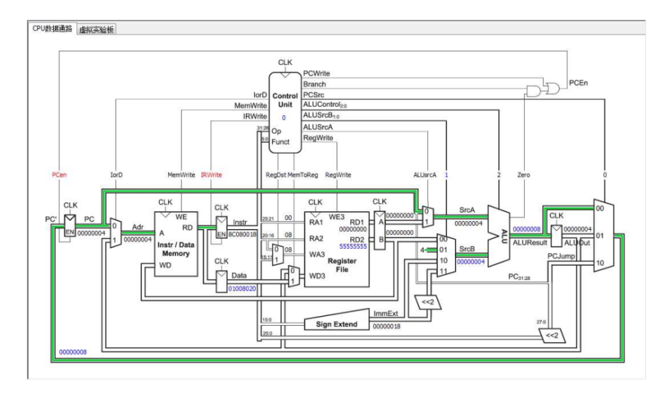 8、微程序控制或基本多周期MIPS等CISC或RSIC實驗CPU的設計調試界面如圖3所示;用戶可以擴充自己的實驗CPU,只需要通過特定的腳本描述CPU的特性即可由實驗調試系統可視化顯示。