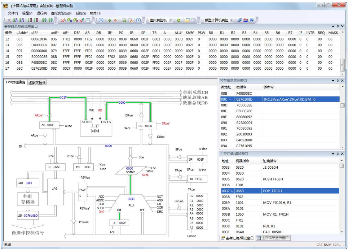 6)模型機的設計調試支持微指令單步、微指令斷點、指令單步、斷點、全速等運行方式。可通過軟件界面輸入、查看和保存控存、主存內容。